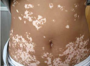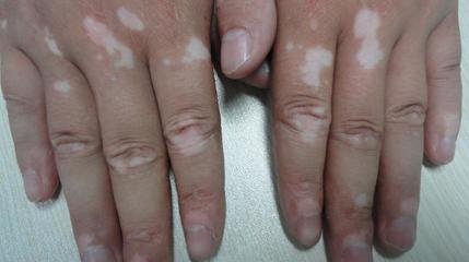 白块的晚期,皮损色素脱失,呈瓷白色斑,白斑大小形态不一等各种白块表现,境界清楚,边缘有色素沉着增加,无自觉症状,暴晒后易出现红斑,甚至水泡,自觉有灼痛、炎症等多种白块表现,白斑可比原发范围大,皮损可发生于任何部位,但较常见于指背、腕、前臂、面颈、及其周围。白斑常对称或单侧分布,甚至如带状沿神经分布。